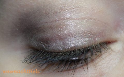 Na bitte, das sieht doch schon besser aus. Ein wenig sieht man in der Lidfalte eine Linie, aber auf dem Lid selbst ist mehr von dem Illusoire verblieben als bei meinem ersten Versuch. Also ich bin schon versöhnlicher gestimmt, muss ich sagen. Allerdings hatte ich von einem Produkt, das sich „long wear luminous eyeshadow“ nennt und fast 30 EUR kostet, erwartet, dass es auch ohne Base hält. Die Mascara war übrigens ein Pröbchen von der Lancome Doll Eyes, da kann man sich das Parfüm fast sparen, so stark riecht die.