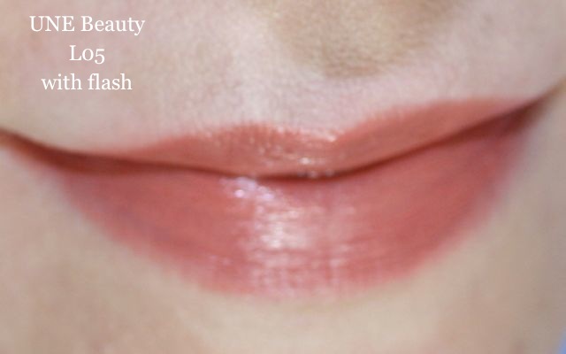 The colour looks natural, it does not have any shimmer in it. The finish is creamy – not glossy, but not matte either. Please see above for pictures. I think the colour of the patch on the tube is a close match to the colour of the lipstick on my lips. Well done, UNE.